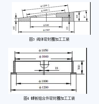 從三偏心金屬硬密封蝶閥的結構特點分析,蝶板組合件密封圈為不銹鋼板與石棉板的組合件,閥體密封圈為硬質合金,硬度很高,進刀量很難控制,不易一次加工成型,而且加工面的粗糙度要求很高。為保證加工要求,工藝過程為閥體或蝶板組合件粗加工—閥體密封圈堆焊硬質合金—保溫12h—熱處理消除熱應力—上工裝粗車密封面—上工裝精車密封面—上磨頭磨削密封面—閥體與蝶板組合件合鏜軸孔—強度試驗—密封試驗。